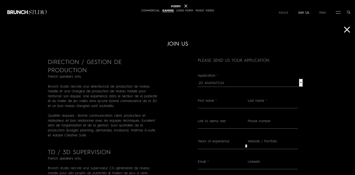 Reprise complète du site internet pour présenter les films classés par réalisateurs et univers (2D, Jeux, Clips, etc). Le défi a été de laisser la main au client sur la présentation de chaque section du site tout en gardant le contrôle sur le design général. Un système de filtres est aussi présent pour affiner la navigation entre les projets.