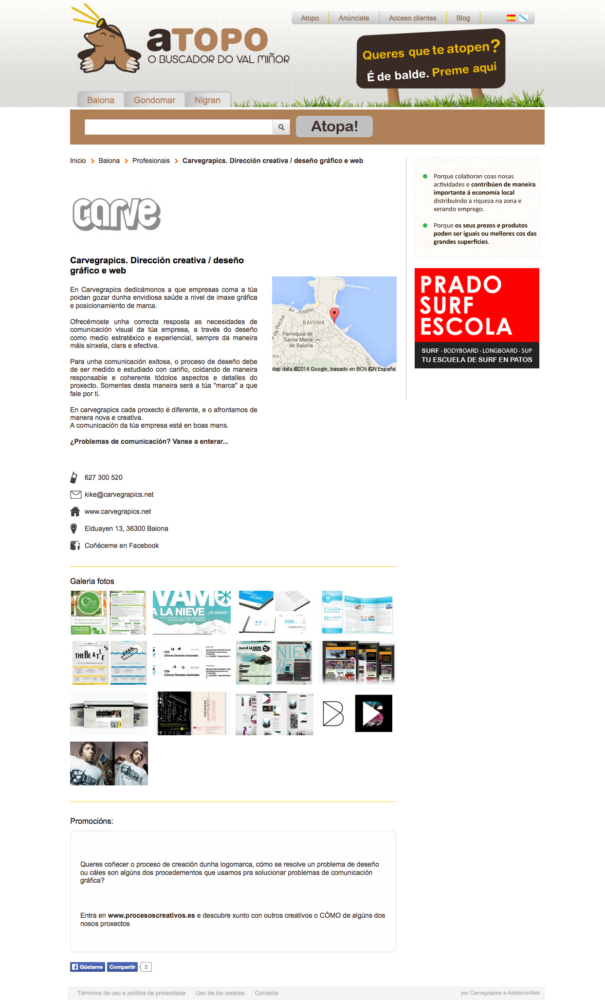 Atopo est un annuaire en deux langues avec moteur de recherche couvrant le Val Miñor, région sud de la Galice espagnole. Permis ses annonceurs on compte tout types de professions, des institutions publiques aux commerçants.